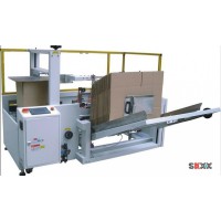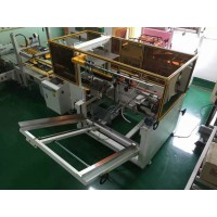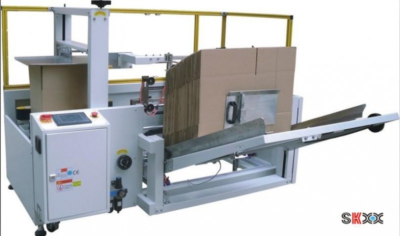 此開箱機結構設計:一次完成紙箱吸箱、開箱、成型、折底、封底等包裝工序。適用于多種尺寸的紙箱自動開箱封底,如需變換紙箱規格,手動調節即可,所需時間1-2分鐘;本開箱機可單機作業,也可與自動化包裝流